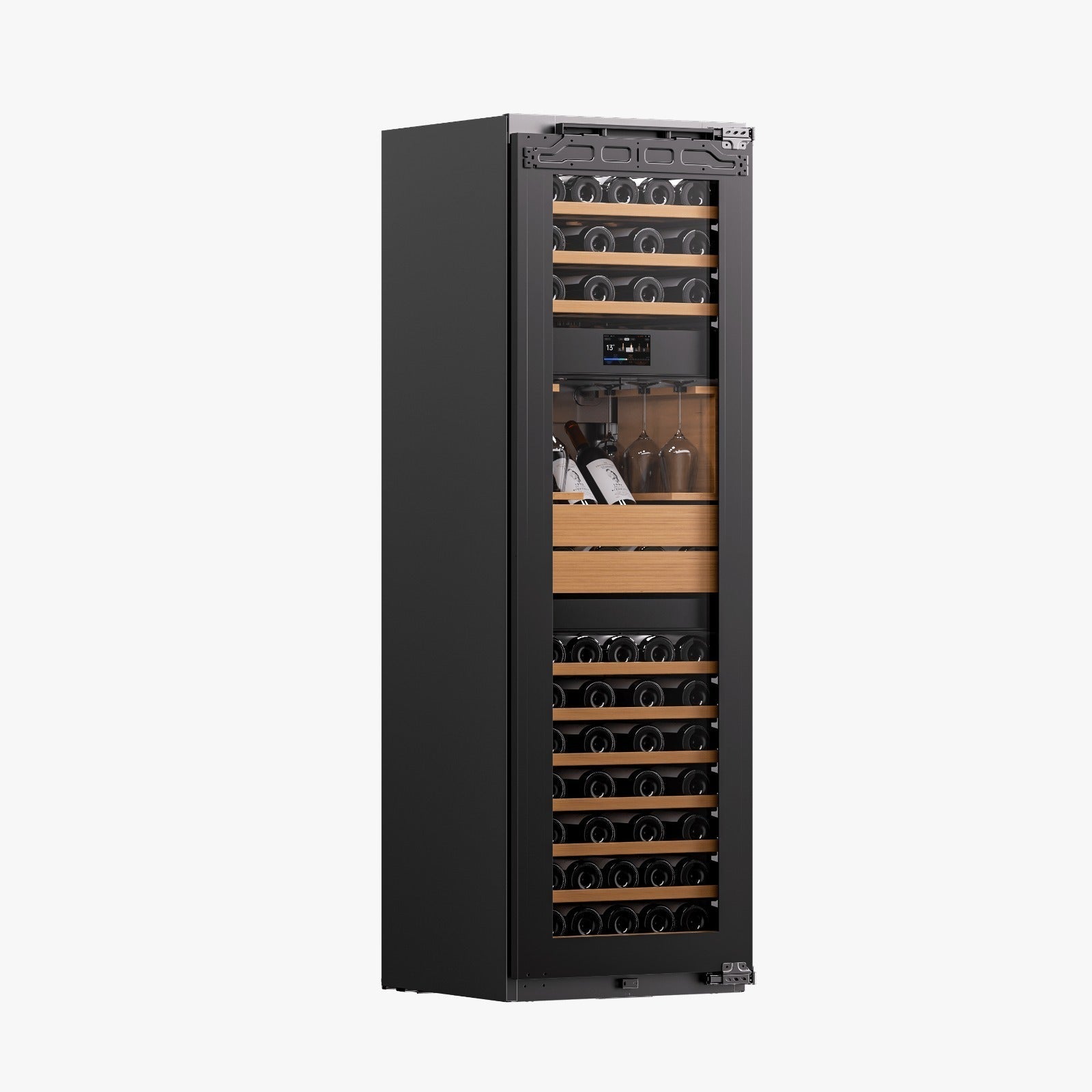 A adega conta com isolamento em camada de ciclopentano ecológico, oferecendo desempenho térmico até dez vezes superior ao convencional. Essa combinação reduz significativamente o consumo de energia e otimiza o espaço interno. A estrutura de isolamento duplo garante proteção ao vinho com eficiência energética e responsabilidade ambiental, mantendo a temperatura estável em todas as zonas.
