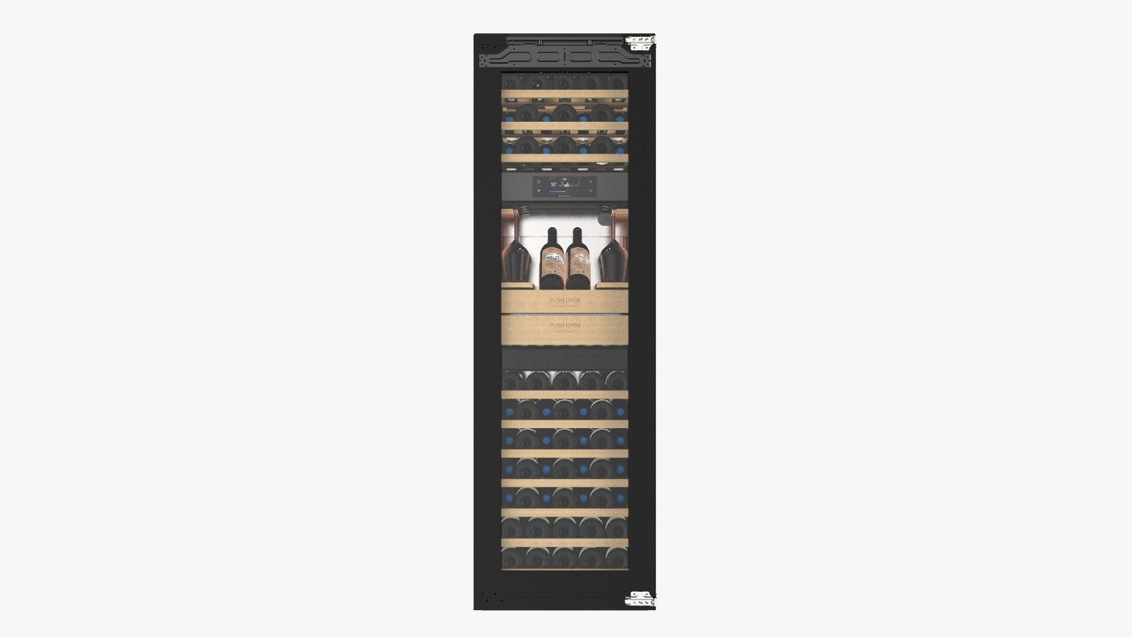Cada zona da adega possui controle independente de temperatura e umidade, com sistema de circulação de ar inteligente. A estrutura interna inclui dutos dedicados e filtro de carvão ativado, que eliminam odores e protegem o vinho. A circulação automática de ar evita interferências entre as zonas, garantindo condições ideais para o envelhecimento e conservação de cada tipo de vinho.